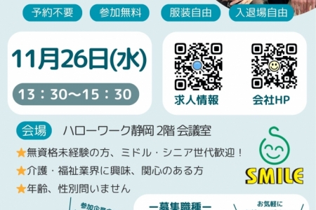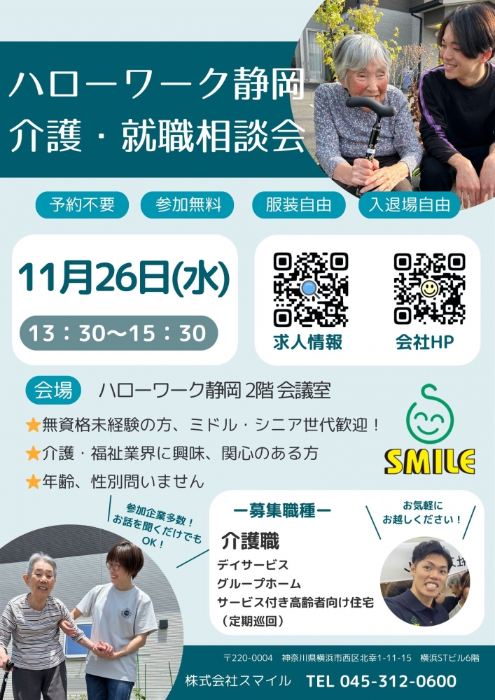 ハローワーク静岡で行われる「介護の仕事 就職相談会」にスマイル、参加します★
