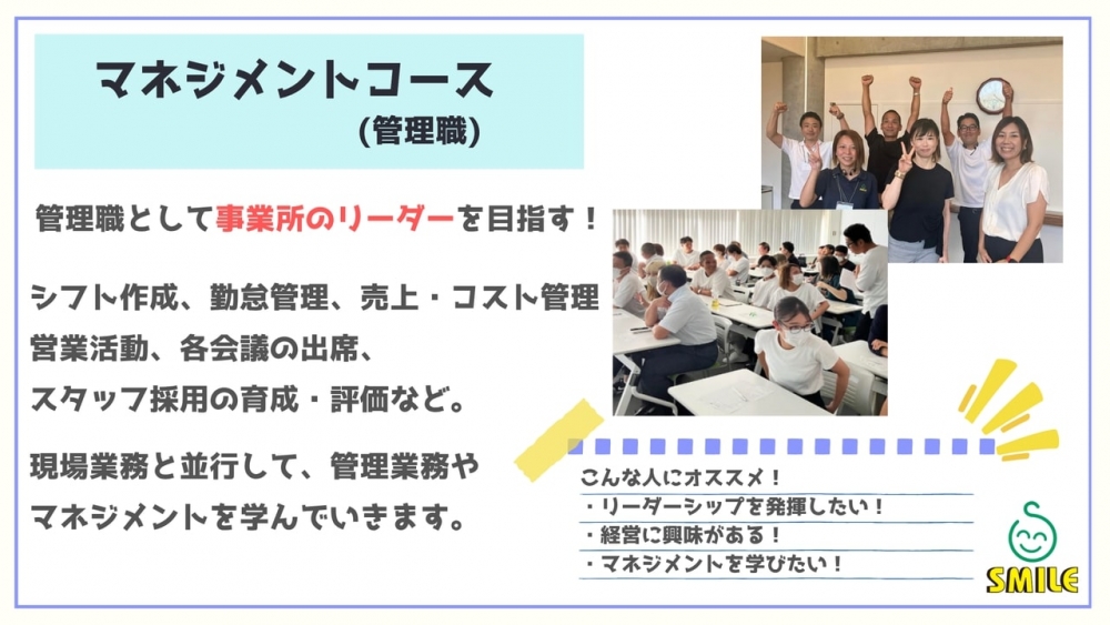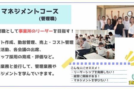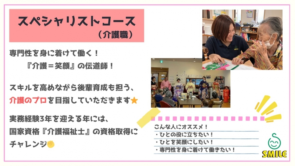 基本的にはスペシャリストコース(介護職)をおすすめしていますが、自分は将来スタッフをまとめる管理職になりたい!!と思う人は、マネジメントコース(管理職)の選択してくださいね☆
