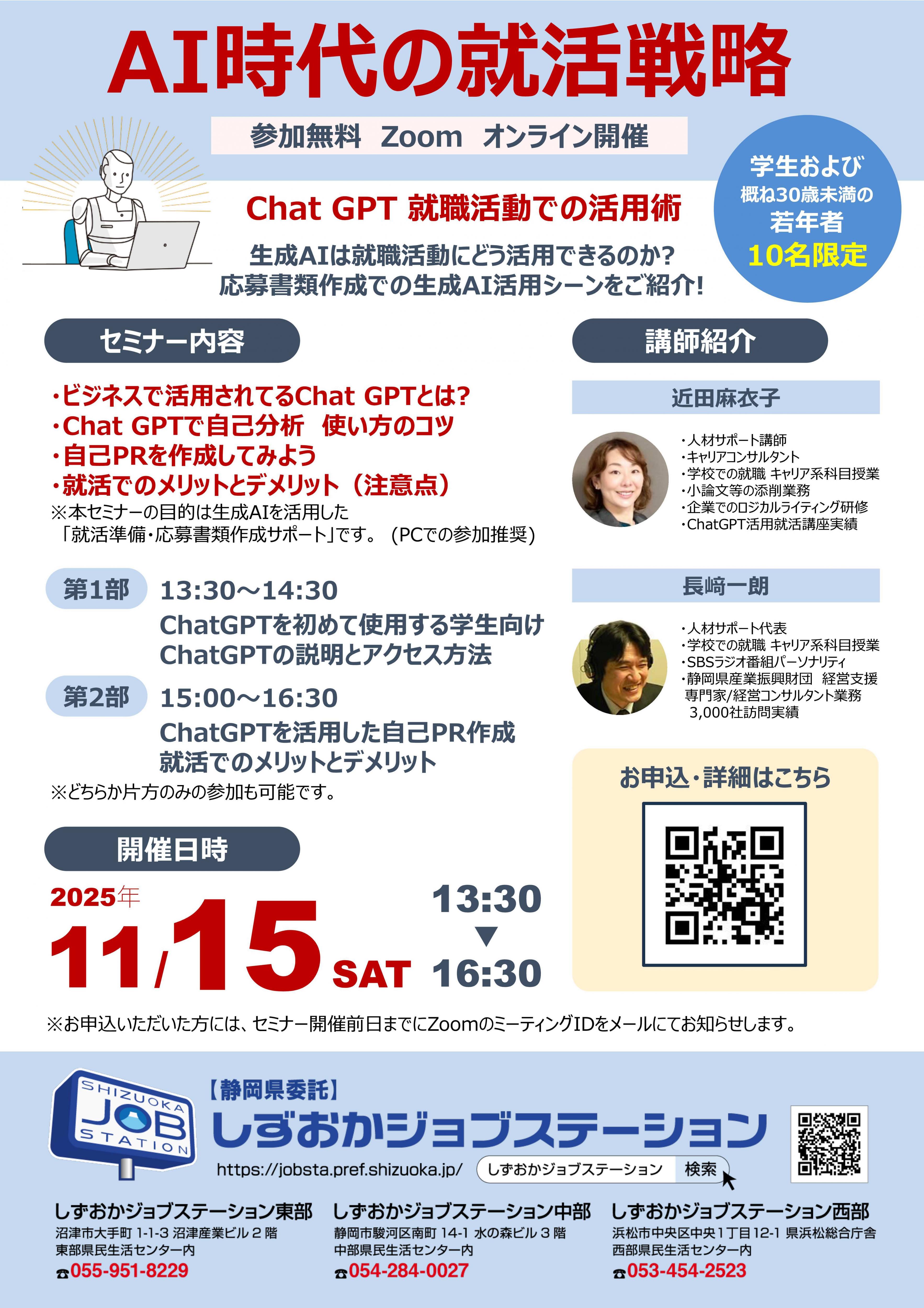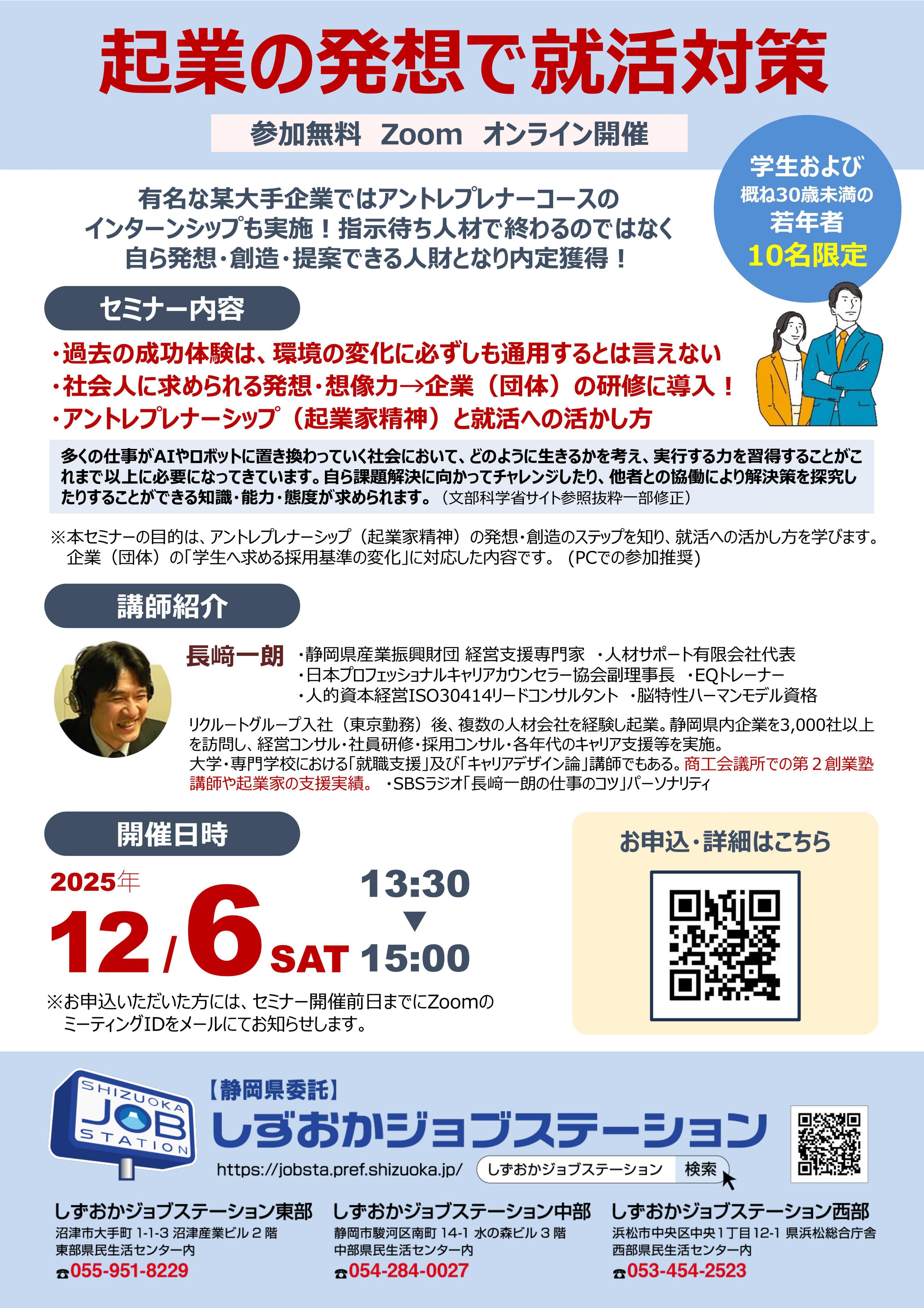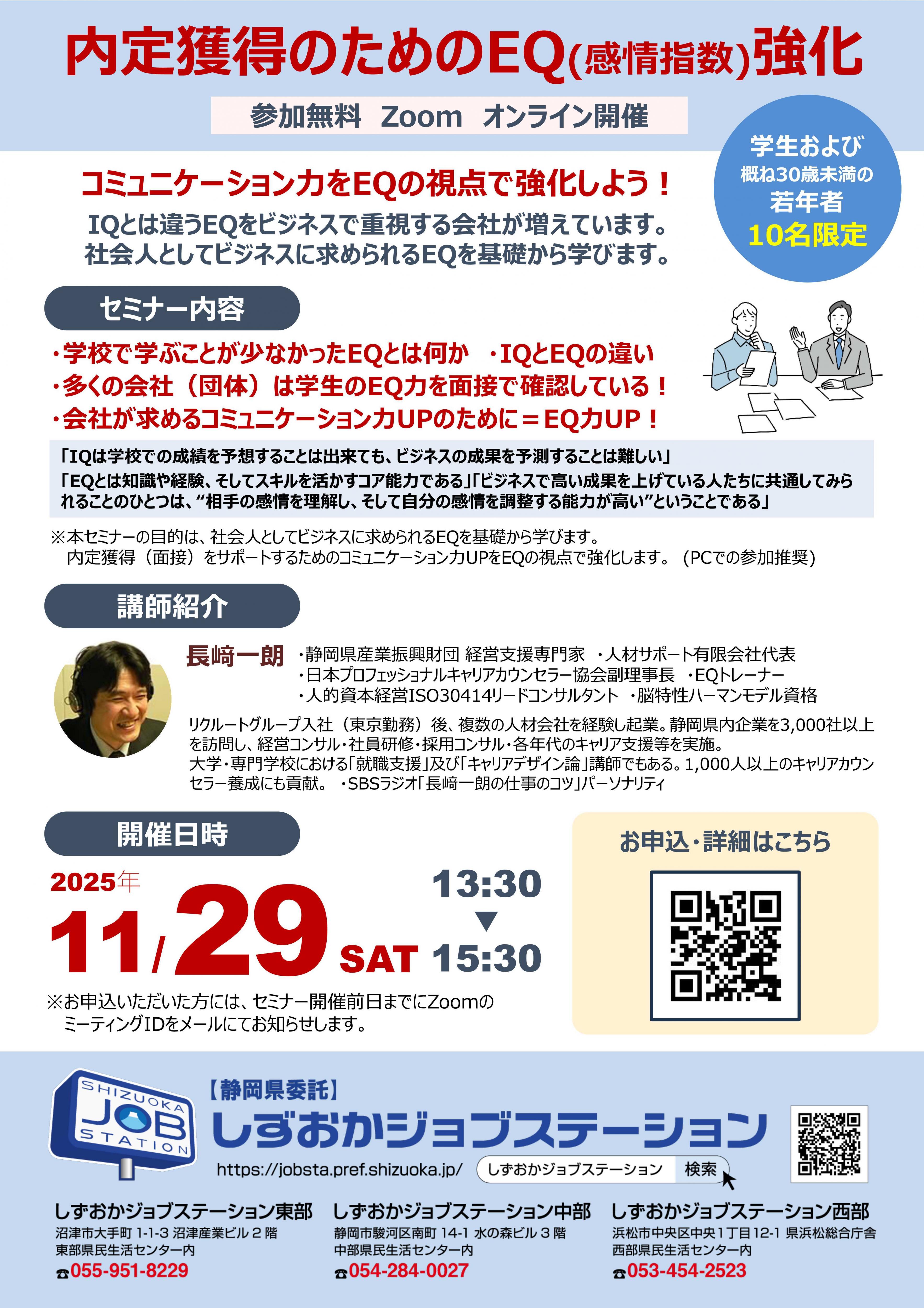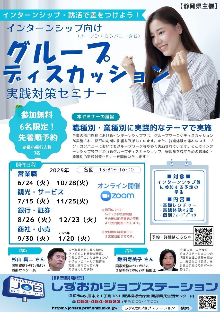 【学生】インターンシップ等「グループディスカッション」【オンライン】 11月 AI時代の就活戦略セミナー【オンライン】 11月 内定獲得のためのEQ(感情指数)強化セミナー【オンライン】 12月起業の発想で就活対策セミナー【オンライン】