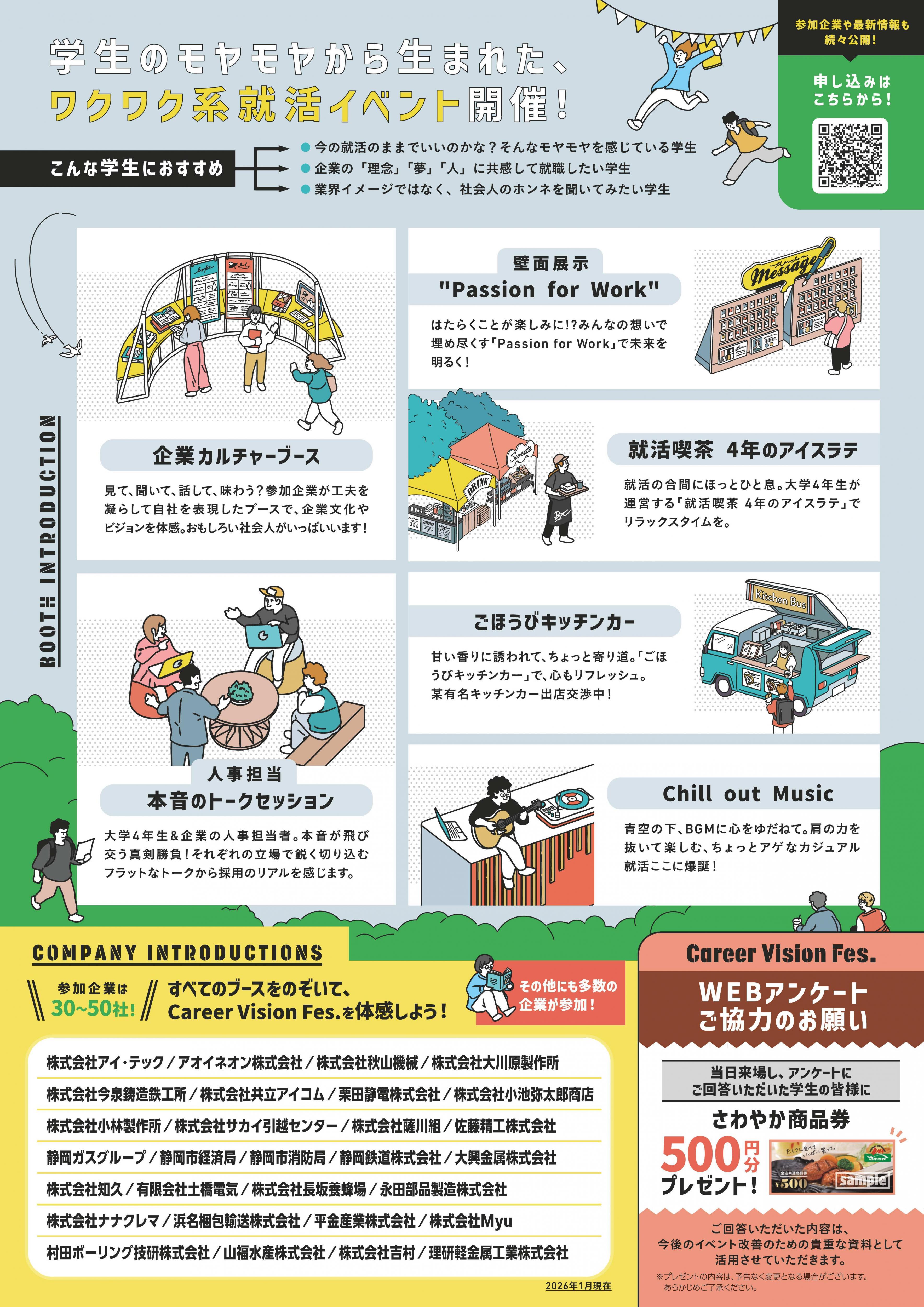 Career Vision Fes実行委員会では、2026年3月、静岡市で”企業の文化”に光を当てた野外フェス型イベント「合同企業文化祭 – Career Vision Fes in Shizuoka-」を開催します。